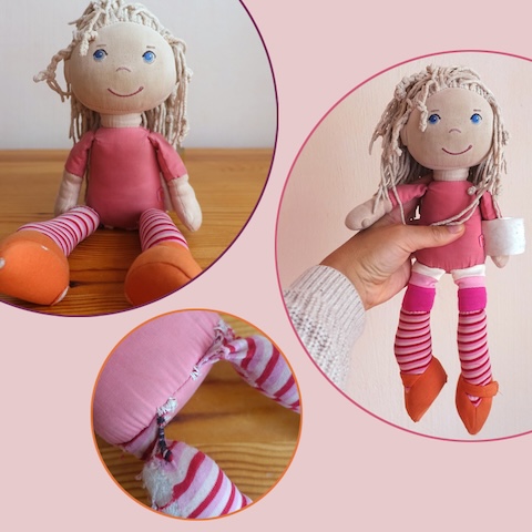 HABA-Puppe Ernie war schon einmal vor anderhalb Jahren bei mir in der Reparatur, damals ging es um ihre Arme. Dieses Mal waren es die Beine, die geflickt werden sollten.