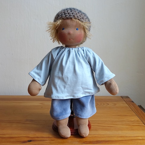 Nils ist 30 cm groß, hat apricotbeige Haut, strohblonde Haare, braune Augen und ein paar Sommersprossen im Gesicht und trägt seegrüne Latzhosen mit zwei großen Taschen, ein blaues Shirt Shirt und eine Mütze im Farbverlauf Graublau, Lila, Hellrot.